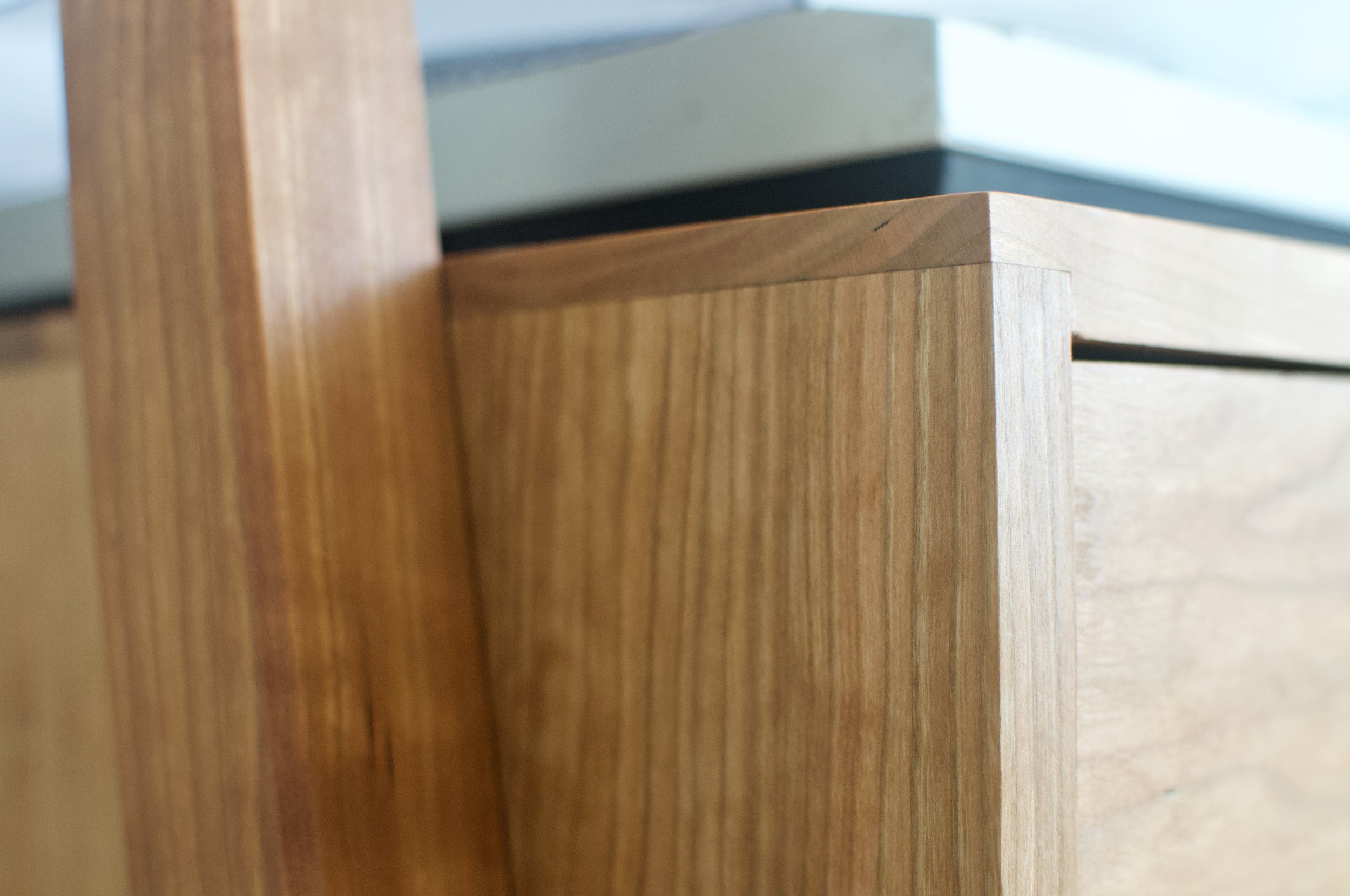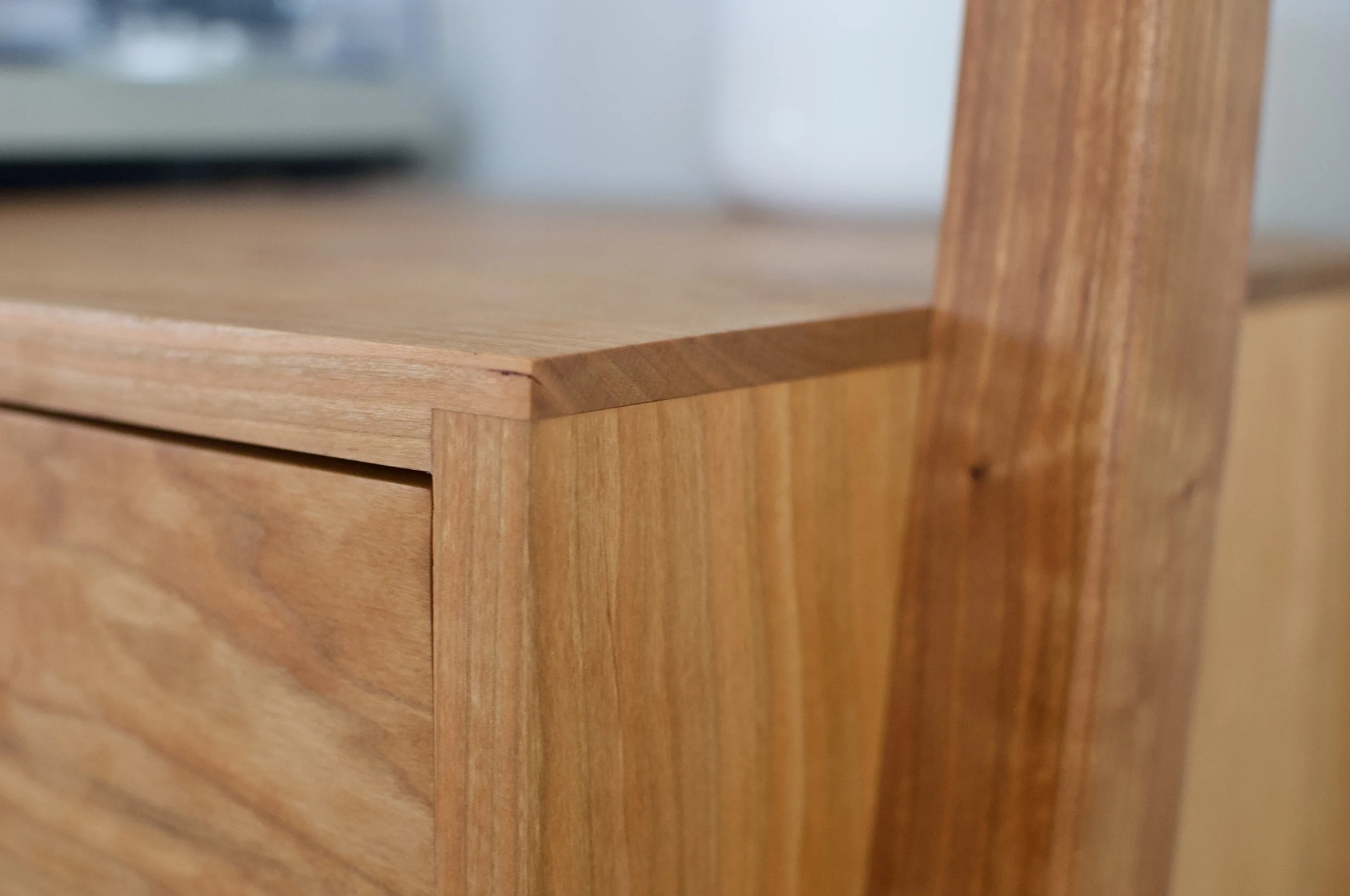 Solid hardwood case, frame, shelving, and drawer fronts with integrated pulls.