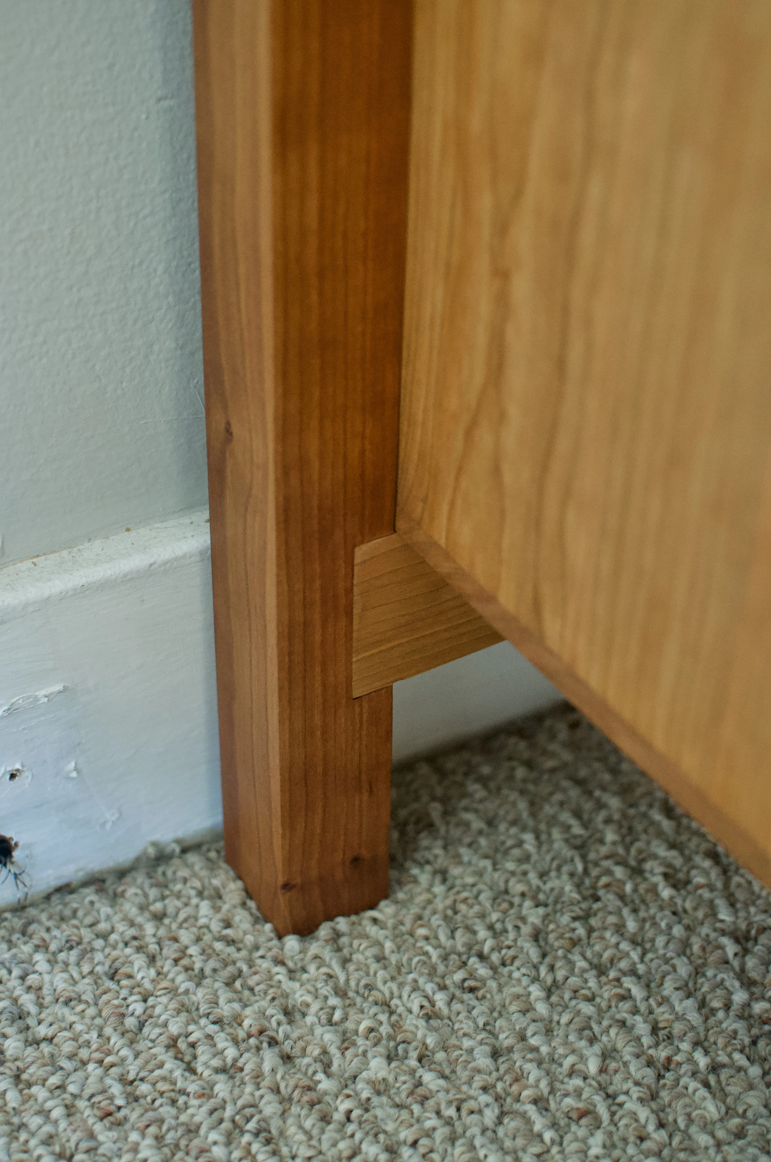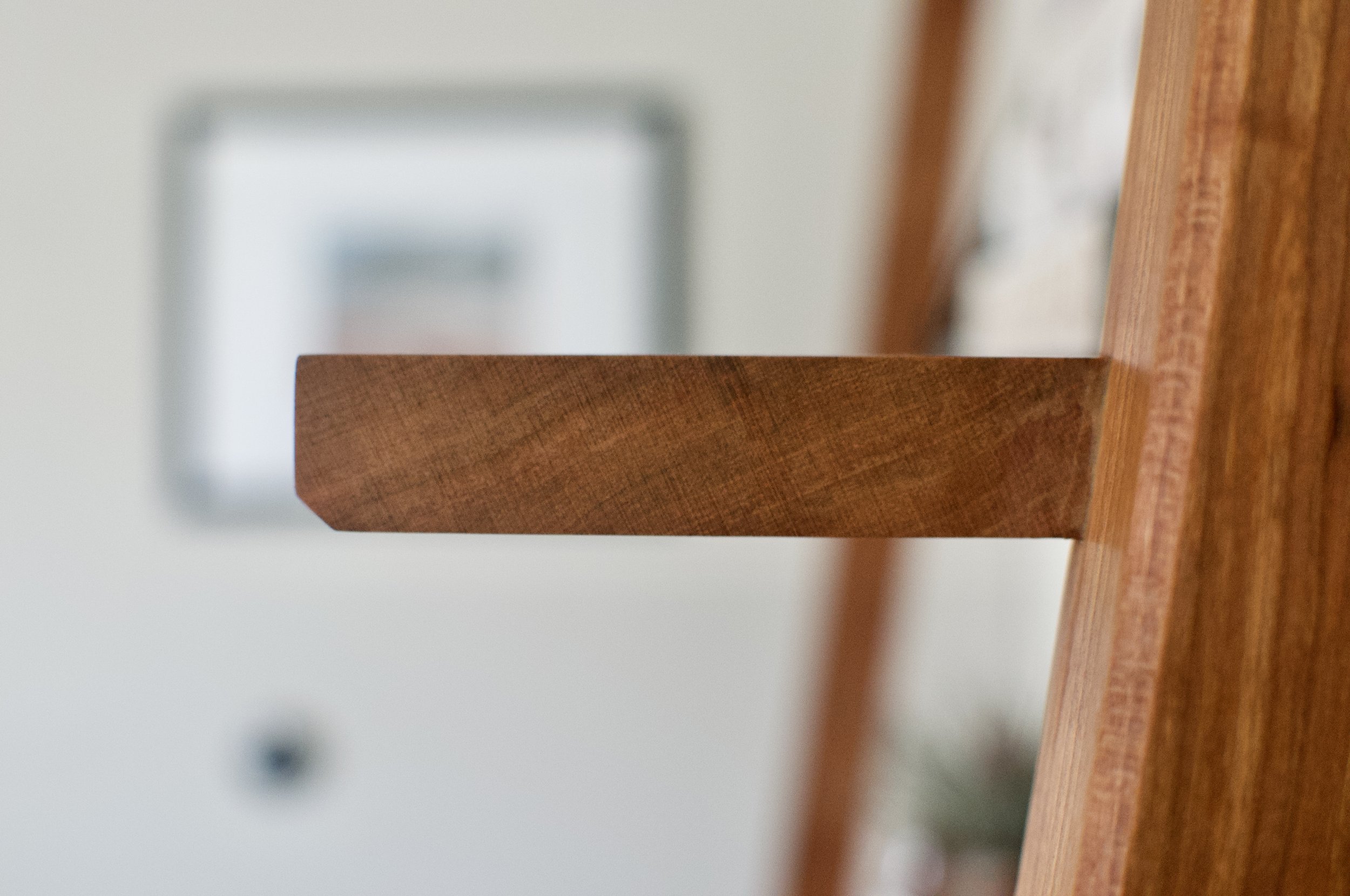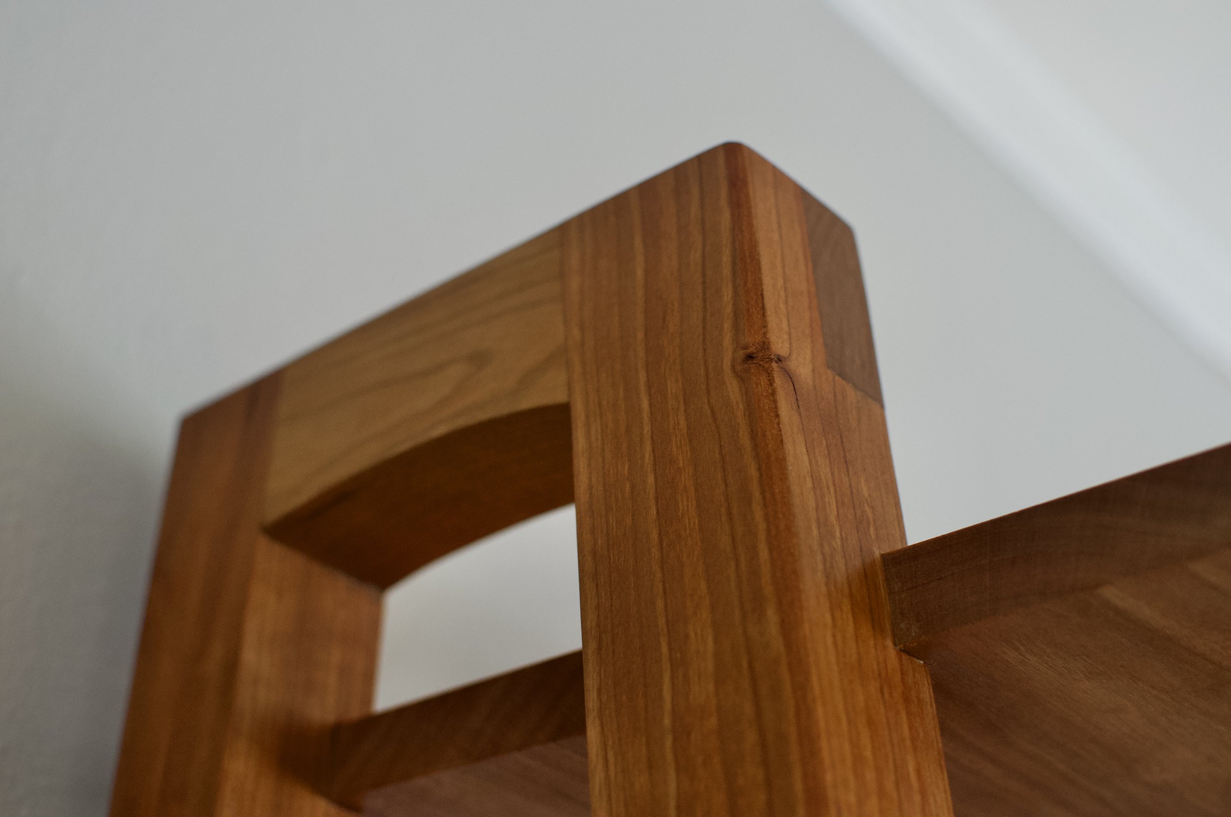 Joinery is intentionally expressed rather than concealed. Subtle rabbeted cabinet connections and exposed dados at the shelves offer a quiet indication of how the piece is made, while the frame is assembled with half-lap joints that reveal end grain as a soft contrast at each intersection.