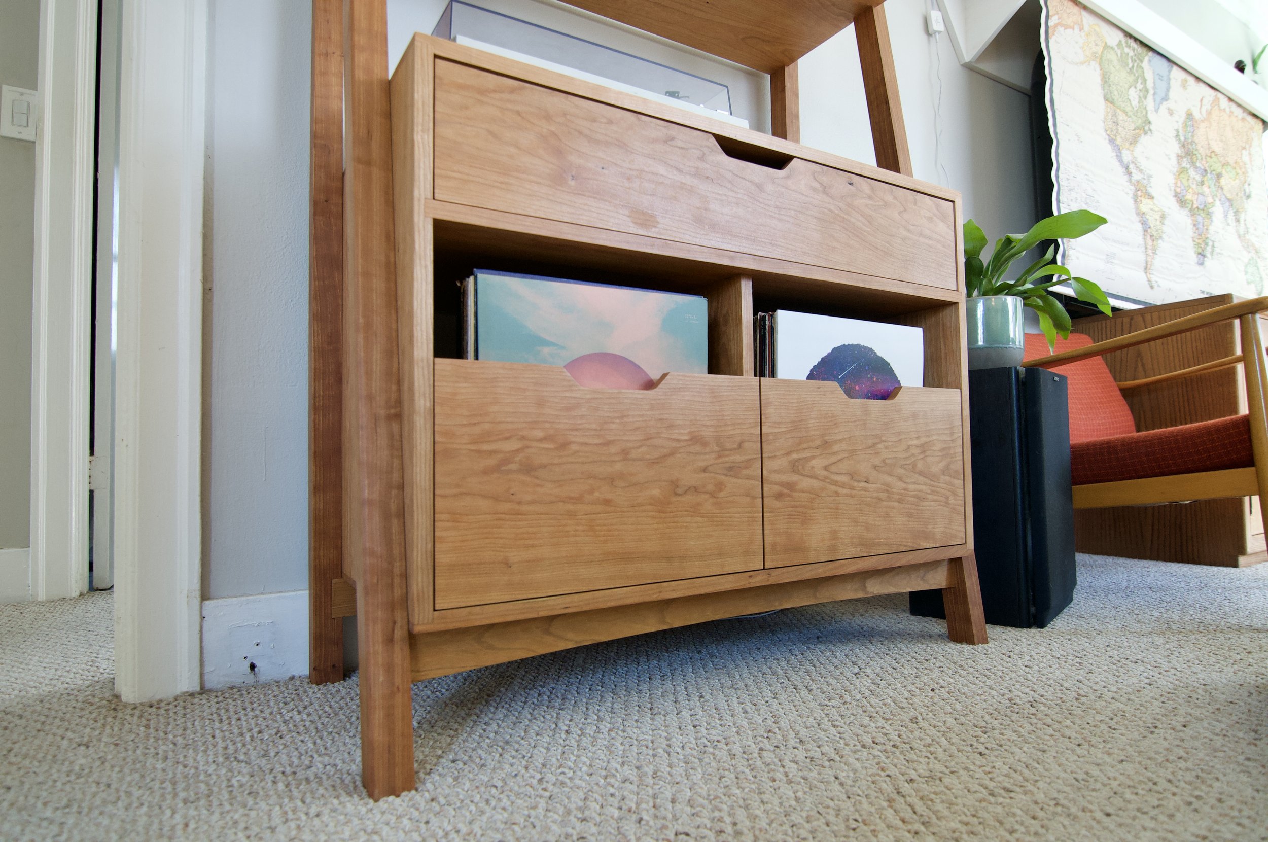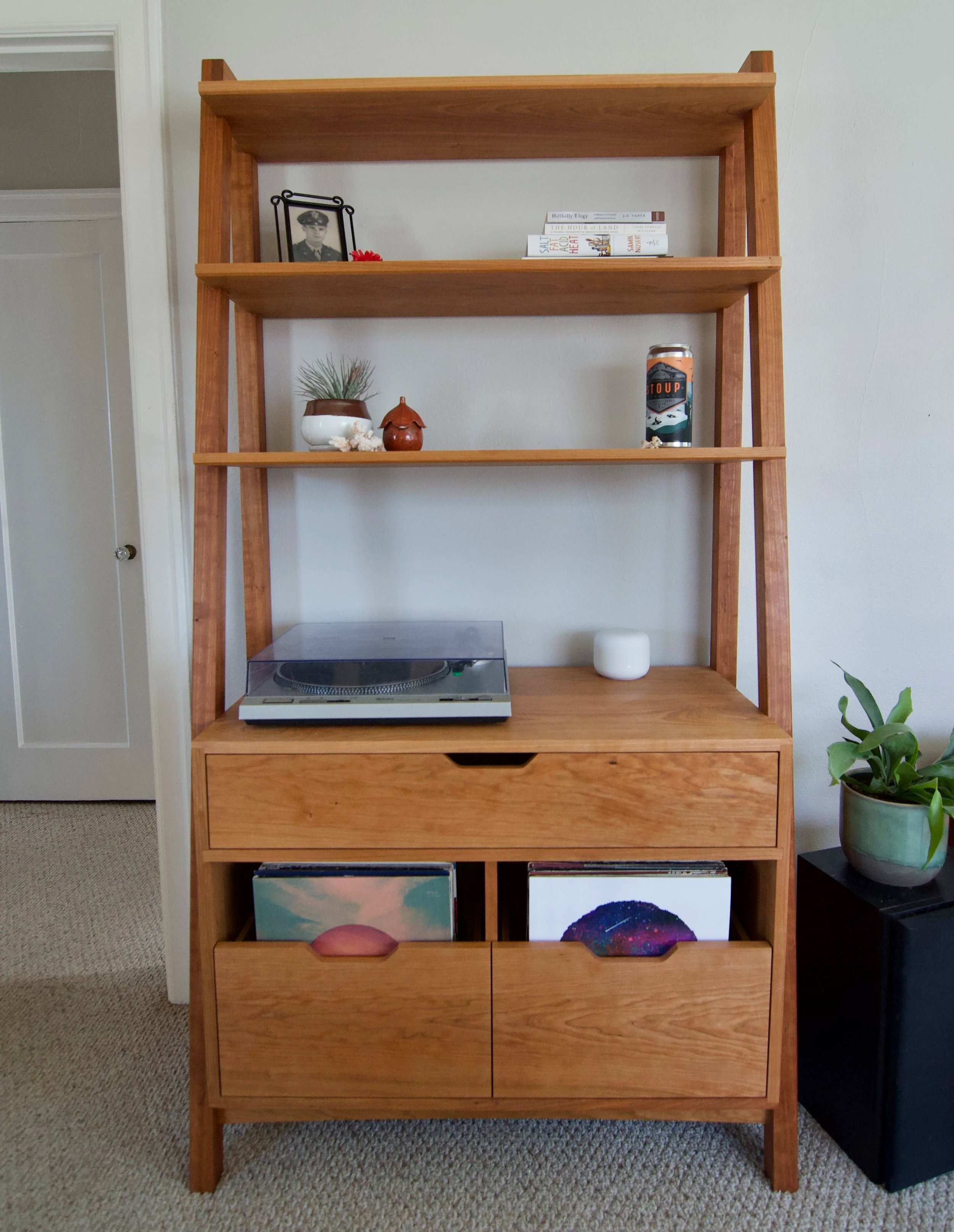 Proportions are carefully considered to accommodate record storage below while maintaining comfortable spacing for books and objects above.